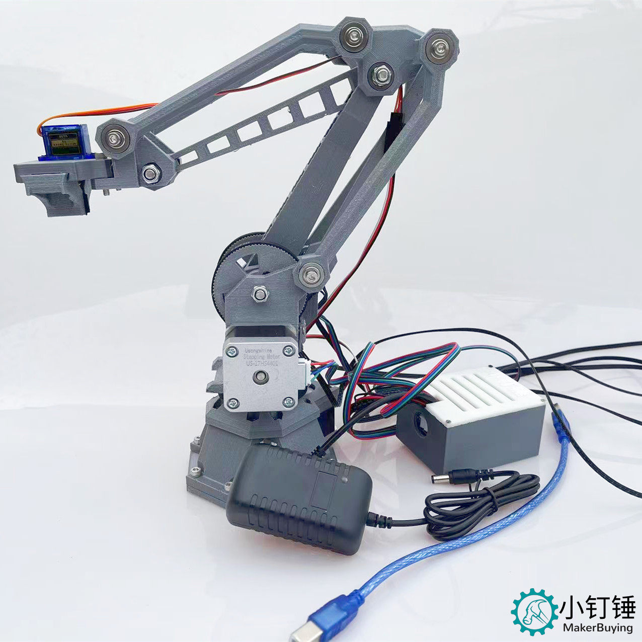 这是一款用3D打印技术生产的一个机械臂,使用3个步进电机,一个sg90舵机,配合arduino开发板和CNC扩展板实现基本控制。