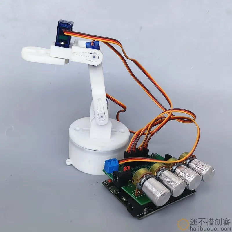 四个电位器旋钮,每一个旋钮控制一个舵机,舵机跟随着电位器的旋转而旋转。